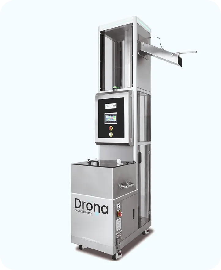The DRONA Product Elevator eliminates the need for manual feeding of tablets and capsules from high-rise hoppers to higher-level blister packing, counting, or inspection machines. With its gentle product handling, it ensures safe transfer without compromising product integrity. Equipped with advanced sensors and CE certification, DRONA streamlines workflow, reduces contamination risks, and enhances operator safety. A space-efficient, durable system, DRONA is designed to integrate seamlessly into modern pharma lines.